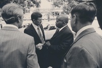 Louis Koch and B.B. Zondani together with other four white men infront of the Grahamstown High Court A series of photographs showing views of forced removal of communities from Klipfontein farm, near Kenton-on-sea, and other areas, to Glenmore in 1979. These photographs were accumulated by Ben Maclennan when he worked as a journalist for Eastern Province Herald, covering the move, and when he wrote the book "Glenmore : the story of a forced romoval" This photograph shows Mr Louis Koch, appointed Chief Director of the Cape Midlands Administration Board, and Mr B. Zondani together with other two white men. It is not clear where they are standing, possibly infront of the Grahamstown High Court