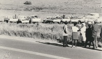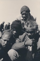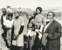 Klipfontein residents during the move to Glenmore, 4 April 1979 A series of photographs showing views of forced removal of communities from Klipfontein farm, near Kenton-on-sea, and other areas, to Glenmore in 1979. These photographs were accumulated by Ben Maclennan when he worked as a journalist for Eastern Province Herald, covering the move, and when he wrote the book "Glenmore : the story of a forced romoval" The photograph shows Klipfontein residents, men and women during the move to Glenmore, April 1979. Mr Shorty Mxolozeli (then aged 78) on far right of photograph. Photograph taken by Jack Cooper, 4 April 1979