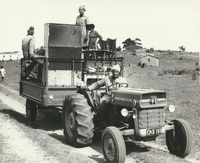 Klipfontein residents during the move in 1979 A series of photographs showing views of forced removal of communities from Klipfontein farm, near Kenton-on-sea, and other areas, to Glenmore in 1979. These photographs were accumulated by Ben Maclennan when he worked as a journalist for Eastern Province Herald, covering the move, and when he wrote the book "Glenmore : the story of a forced romoval" This photograph showing Klipfontein residents in a tractor, together with their belongings taken to Glenmore. Photograph taken by Jack Cooper in 1979