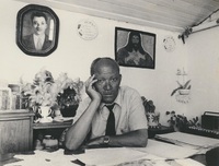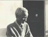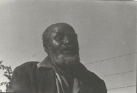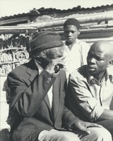 Mr Mani Billy, a Kenton-on-Sea resident, smiling wryly at news about eviction Photographs taken at the time of the Klipfontein evictions, the resultant trial at the Supreme Court Grahamstown, and the eventual settlement of those evicted in the Glenmore resettlement location, showing some of the residents involved, officials, members of the press, as well as aerial and on site views of Glenmore. Photographers: Dave Forbes, Ben Maclennan, Evert Smith, and an unknown photographer