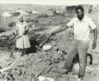 Klipfontein residents during the move in 1979 A series of photographs showing views of forced removal of communities from Klipfontein farm, near Kenton-on-sea, and other areas, to Glenmore in 1979. These photographs were accumulated by Ben Maclennan when he worked as a journalist for Eastern Province Herald, covering the move, and when he wrote the book "Glenmore : the story of a forced romoval" The photograph shows a man and a woman in Klipfontein, probably husband and wife, standing next to a pile of fire wood. Photograph taken by Jack Cooper in 1979
