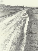 Muddy road inbetween two wooden fences - bridge A series of photographs taken at the time of the Klipfontein evictions, the resultant trial at the Supreme Court Grahamstown, and the eventual settlement of those evicted in the Glenmore resettlement location, showing some of the residents involved, officials, members of the press, as well as aerial and on site views of Glenmore. Photographers: Dave Forbes, Ben Maclennan, Evert Smith, and an unknown photographer. This photograph shows a muddy road inbetween two wooden fences, probably a bridge.