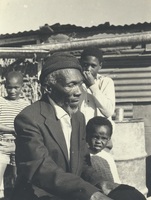 Mr Joseph Gqozombana surrounded by three kids Photographs taken at the time of the Klipfontein evictions, the resultant trial at the Supreme Court Grahamstown, and the eventual settlement of those evicted in the Glenmore resettlement location, showing some of the residents involved, officials, members of the press, as well as aerial and on site views of Glenmore. Photographers: Dave Forbes, Ben Maclennan, Evert Smith, and an unknown photographer