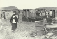 Mrs Noliti Boko in Klipfontein, March 1978 A series of photographs showing views of forced removal of communities from Klipfontein farm, near Kenton-on-sea, and other areas, to Glenmore in 1979. These photographs were accumulated by Ben Maclennan when he worked as a journalist for Eastern Province Herald, covering the move, and when he wrote the book "Glenmore : the story of a forced removal. This photograph shows Mrs Noliti Boko standing infront of a shack with her belongings lying outside, waiting to be taken to Glenomore. Photograph reprinted by Colin Urquhart, September 1983