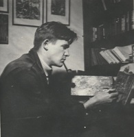 Guy Butler as student at Rhodes University College, in his room at Milner House busy painting with a palette knife, 1938 -