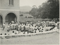 Pupils at Armstrong House playing outside A photograph album showing views of buildings and people at St Michaels and St Matthews Missions in Keiskammahoek, South Africa.. This photograph is showing pupils in one of the dormitories at St Matthews, playing outside.