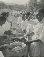 Sports Day at St Matthews - meal time A photograph album showing views of buildings and people at St Michaels and St Matthews Missions in Keiskammahoek, South Africa.. This photograph is showing girls at St Matthews Mission on their sports day, preparing to serve food to others during meal time.