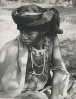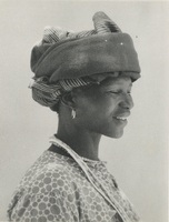 Xhosa woman at Sport Day in St Matthews A photograph album showing views of buildings and people at St Michaels and St. Matthews Missions in Keiskammahoek, South Africa.. This photograph shows a local Xhosa woman wearing her traditional garb, a doek wrapped around her head shows she is married.