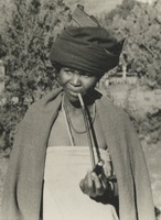 Xhosa woman smoking a pipe A photograph album showing views of buildings and people at St Michaels and St. Matthews Missions in Keiskammahoek, South Africa.. This photograph shows a local Xhosa woman smoking a pipe. She is wearing her traditional garb, a doek wrapped around her head show she is married.