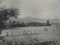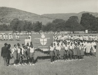 Inter-Institutional Sports Day Parade A photograph album showing views of buildings and people at St Michaels and St Matthews Missions in Keiskammahoek, South Africa.. This photograph is showing children at St Matthew's College during an inter-institutional sports day, parading and bearing their school flags. Other schools that took part in the event included, Lovedale College and Fort Hare College.
