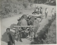 Patients transport to hospital A photograph album showing views of buildings and people at St Michaels and St Matthews Missions in Keiskammahoek, South Africa.. This photograph is showing a sledge pulled by oxen, transporting patients to hospital, with a young boy leading the sledge.
