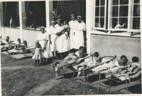 TB spine children on their frames at St Matthews Hospital A photograph album showing views of buildings and people at St Michaels and St. Matthews Missions in Keiskammahoek, South Africa.. This photograph shows nurses and children who suffered from spinal tuberculosis lying on their special orthopedic frames at St Matthews Hospital.