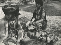 Women and child at Sports Day in St. Matthews A photograph album showing views of buildings and people at St Michaels and St. Matthews Missions in Keiskammahoek, South Africa.. This photograph shows two local African women wearing their traditional garb, and an infant sleeping on the ground. They have come to watch sport events at St Matthews.
