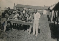 Keswa (catechist) with carpentry class - Umlazi Mission, Natal, 1934 Album relating to the Zulu people of Zululand in the Natal Province during the years 1930-31 and 1934, taken at various places, including Chads College, Ladysmith; Springfield, Mooirivier; the Leytown Pohams House ("Hemrock"), Nottingham Road; Umlazi Mission; Etalaneni; Kwamagwaza; on the way to Biyela : mainly photographs, some original, some photocopies, with descriptive text in some cases / photographer unknown. 50 Photographs in one album : b+w (some sepia), 22 cm x 10 cm or less.
