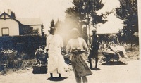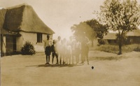 Children assembled in front of houses, 1930 Album relating to the Zulu people of Zululand in the Natal Province during the years 1930-31 and 1934, taken at various places, including Chads College, Ladysmith; Springfield, Mooirivier; the Leytown Pohams House ("Hemrock"), Nottingham Road; Umlazi Mission; Etalaneni; Kwamagwaza; on the way to Biyela : mainly photographs, some original, some photocopies, with descriptive text in some cases / photographer unknown. 50 Photographs in one album : b+w (some sepia), 22 cm x 10 cm or less.
