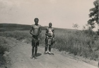 Boys on their way to a feast near Biyela Zululand, March 19, 1934 Album relating to the Zulu people of Zululand in the Natal Province during the years 1930-31 and 1934, taken at various places, including Chads College, Ladysmith; Springfield, Mooirivier; the Leytown Pohams House ("Hemrock"), Nottingham Road; Umlazi Mission; Etalaneni; Kwamagwaza; on the way to Biyela : mainly photographs, some original, some photocopies, with descriptive text in some cases / photographer unknown. 50 Photographs in one album : b+w (some sepia), 22 cm x 10 cm or less.