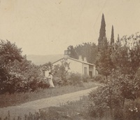 Photograph titled: Woman in lush garden Photograph of a woman (presumably a member of the Hewson family) in a large garden. There is a white house in the background.,Donated by L.A. Hewson (Deposit 154)