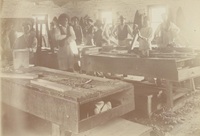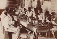 Trade school for Africans Photograph album : assembled and donated by L.A. Hewson / photographer/s mostly unknown,Photograph of twelve African men learning to be shoemakers.,Donated by L.A. Hewson (Deposit 154)
