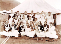 Norvalspont - Medical staff During the Anglo-Boer War, Norvalspont (South Africa) was one of the Prisoner-or-War (POW) camps used by the British Forces to imprison for Boers from South Africa. Elria Wessels wrote the following as a caption to the image, on the Facebook group “Norvalspont Concentration Camp: Norvals Pont was probably established about November 1900, in order to relieve the overcrowded Bloemfontein camp with its dire shortage of water The first superintendents, both military men, seem to have been capable people; Lieutenant Wynne of the Imperial Yeomanry was described as the ‘Father of the Camp’ and he was succeeded in January 1901 by Major du Plat Taylor of the Grenadier Guards, who instilled ‘firm military discipline’. At the end of February 1901, when the camp passed into civilian control Cole Bowen was appointed. Almost everyone who encountered him commented on his calm efficiency. Emily Hobhouse wrote later that Cole Bowen possessed ‘marked administrative powers; his rule was firm, just and kind and he seemed possessed of unlimited resources’ It was not that Norvals Pont lacked the problems of the other camps. On the contrary, the measles epidemic struck early and was followed by scarlet fever and diphtheria. Families poured in without warning and tents and blankets ran out. And, with all these struggles, Cole Bowen had to contend with an unpleasant medical officer. Some people deserted and Cole Bowen was forced to fence in those who were a ‘bad influence’. Nor did Cole Bowen show overt sympathy for the Boers. Despite his determined loyalty to his employers, the Boers of Norvals Pont presented a number of testaments to head office and to Cole Bowen himself, affirming their satisfaction with the camp. S.D. Poign provided a long statement describing their lives in considerable detail He concluded: ‘With these few suggestions, I, a person brought here against my will, and wish [to] beg to attest, that I have no reason to object in any manner over the way in which I have been treated while in this camp, neither have I any reason to complain that the authorities have not treated me with that courtesy which I as a man and a gentleman could expect under the peculiar circumstances under which I am placed.’ The chaplain, the Rev. A.P. van der Merwe, asserted that everything possible was done for the comfort of the people. om Holland, testified in some detail. ‘I cannot judge of other camps but I believe this is one of the best’, she wrote. At first the camp did not have a resident medical officer but Dr Michie of the RAMC attended the inmates. His services were necessary for, consisting of families from Bloemfontein, Norvals Pont was struck early by the measles epidemic. But Michie was not easy Even then the staffing problems at Norvals Pont were not over. The most prominent of the women doctors of the camp systems, the Hon Dr Ella Scarlett, took over from Michie. . Nevertheless, she worked hard on behalf of the Boers who do not seem to have complained about her. Later doctors were equally troublesome. Drs Caldwell and McArthur, both brusque men, did not get on and the latter had to be transferred. Caldwell also quarrelled with the admirable Sister Broers, who was transferred to Bethulie, and he then fell out with Broers’ replacement. Inevitably, such a man was at odds with Dr Ella Scarlett who, he said, was lax and ignored his authority. The correspondence does suggest that Scarlett was wilful but Caldwell had a poor record in his relationships with the medical staff. Apart from measles, in April 1901 scarlet fever ran through the camp, followed by diphtheria. Michie struggled to isolate the sufferers, forced to house them with their families, although he knew that the infection was likely to be passed on. Staff shortages may explain some of his irascibility. Neither trained nurses nor civilian doctors could be obtained in South Africa in the early months of 1901, head office explained when Michie appealed for more qualified medical staff. Fortunately the arrival of Miss Broers relieved the situation slightly. Yet mortality remained low in Norvals Pont camp.”