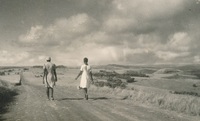 Two women walking down the road Photograph titled: "On the road to the store".