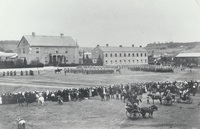 View of a military parade on the Drostdy grounds, Grahamstown, ca. 1895 View of a military parade on the Drostdy grounds, Grahamstown, ca. 1895, with a crowd of spectators and carriages in the foreground