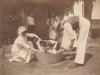 Time to wash the family pet dog Photograph of woman and man bathing a dog with three women watching