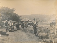 Wagon travelling down Queen's Road, 1926 Photograph of a wagon being pulled by several oxen. A note in the bottom right corner reads: “In Queens Road” -