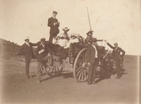 Group of people on a horse drawn carriage taking a break Group of historical Ford Model T