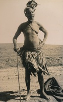 Man wearing animal skins A man wearing a traditional dress consisting of animal skins and feathers