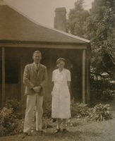 Man and woman standing in front of a house dated 1948 A man and woman standing in front of an old building