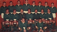 Springboks England v Ellispark Team Springboks England v Ellispark Team, Team photograph with rugby players wearing Springbok uniform (white shorts, green jersey with Springbok insignia, green socks with yellow stripes), Group photograph, Colour photograph, Indoor photograph, Two men sitting have formal clothes on, blazers green and bearing the Springbok insignia, Players standing have arms behind their backs, Players sitting have arms in their laps, Agter: Theo Sauerman, Joggie Jansen, Piet du Plessis, John Williams, Albie Bates, Ray Carlson, Niek Bezuidenhout, Piston van Wyk, Middel: Jan Ellis, Tonie Roux, Mnr Johan Claasen, Piet Greyling, Mnr Jannie le Roux, Syd Nomis, Gert Muller, Voor: Dawie Snyman, Joggie Viljoen.