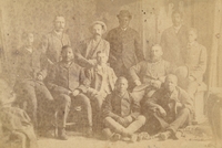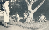 Sister overlooking four boys Photograph titled: "Sister Rowe among the boys".