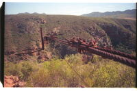 Eastern end of Baviaanskloof, Willowmore Mechanism for anchoring and delivering a boxcar across a gorge from Pisgoedvlakte (behind camera) to level farmground beyond where old fallow lands can be seen (out of picture).