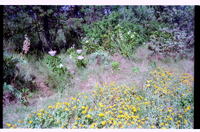 Entrance road to Van Staden's Wild Flower Reserve, Port Elizabeth Mixed flora near entrance. Yellow composites in foreground; Protea cynaroides and Watsonias in background against shrubbery.