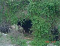 Entrance to cave in low dune in wide open valley in Sacramento Reserve, Schoenmakerskop, Port Elizabeth Note heavy drapings of Cynanchum obovatum creeper.