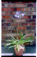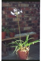 Echodale farm, Lower Elands River, Uitenhage First flowering - Agapanthus praecox - in pot of plants collected in March 1995 (after 33 months). Taken from a clump of 155 plants in a remote part of the farm. Colour here too pale; was a deeper blue.