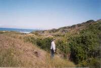 Entrance to Schoenmakerskop cave showing position in relation to the sea Lies in a hollow from which rainwater has no escape other than through the cave then out, presumably through seepage, beneath the scrub-covered dune behind into vlei behind the seashore rocks.