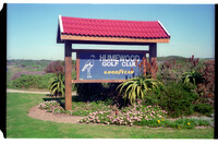Entrance to Humewood Golf Course, Summerstrand Daisies planted about the base with aloes also as decoration, Osteospermum jucundum daisies. An example of what indigenous plants can do to brigthen up a stark notice board.