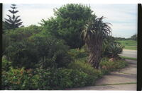 Garden at 43 Admiralty Way, Summerstrand, Port Elizabeth Encephalartos altensteinii plants (left hand one with at least three cones) at the base of one Encephalartos. With Aloe ferox and Strelitzia reginae in background.