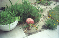 Garden at 86 Kruger Gardens, Summerstrand, Port Elizabeth Boophone disticha in garden pot. First flowering after being saved from vandalism near The Willows, four years ago when nearly dessicated. Yet species said not to flower when removed to gardens.