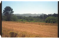 General area of the former Galgenbosch (Fairlight/ Sunnyside farms of today) at Thornhill The regular campsite of early travellers. Witteklip sector of Van Stadensberg in background. Foreground strip is grassy patch recently mown. Area now overrun with alien pines, wattles & gums.