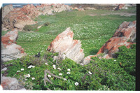Grassy area behind coastal rocks at Noordhoek, Marine Drive, Port Elizabeth Spread of Osteospermum fruticosum daisies. One of many such carpets locally. After good winter season.