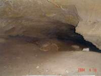 Interior of small cave in Sacramento Reserve, Schoenmakerskop, Port Elizabeth Front covered by draping creeper-cloth. A Man can stand up fairly comfortably, sloping away to tunnel.