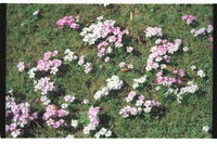 On grassy pavement at Beyers Street, Summerstrand, Port Elizabeth Predominantly pale pink form of Oxalis imbricata, portion of a larger display here in contrast to predominantly white or rich pink displays elsewhere in Summerstrand at the same time. A few white and dark pink variants among them.