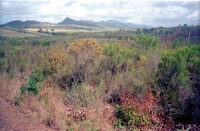 Pirie Mountain, King William's Town Cape and Gurney Sugerbird Promerops cafer & Gurneyi country. The left-hand dome is Hoho Peak, or Pirie West Peak, on the western slopes of which both species where found occupying and nesting in a thicket of tall, dense Protea subvestita, almost the last patch of any size on these mountains. The dark areas on the slopes are protea trees. Those on top had been burned out. Such thickets would have been more widespread in the past. Below are some Protea multibracteata plants. The thickets of subvestita were burnt out in the late 1960's to make way for stock grazing.