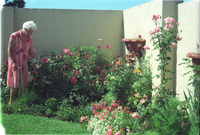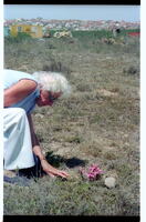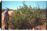 Pisgoedvlakte, eastern approach to Baviaanskloof, Willowmore Mrs. M.J.Collins examining a large shrub of Leucospermum cuneiforme in flower.