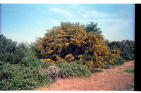 Part of unused campus PE Technichon Encroachment of alien Black Wattle, in flower, into fynbosveld. Indigenous Metalasia and Chrysanthemoides in front, flowering wattle centrally with massed Rooikrans wattle, Acacia cyclops, in background.