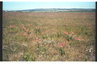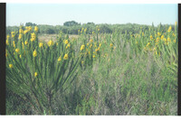Roadside of National Road (N2) about 12 km west if Port Elizabeth central Cyclopia pubescens in damp area after good winter rains. Apparently not seen thus annually. Beneath aborted overhead road construction. Found in two large fields, the other visible in the background.