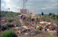 Rocky summit of eastern of the 3 Coega Kops Showing typical vegetation. Coral aloe, A. striata in good flower. Police radio mast on summit beside trig-beacon.