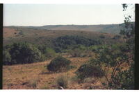 Upper Assegaaibosch River valley, on Assegaaibosch farm Origionally an outspan in the early 1770's. The dark green patch of bush-forest on slope in the mid-distance hill may well be the origin of the name Assegaaibosch as recorded in 1797. Assegaaihout trees, Curtisia dentata. Assegaaihout trees still occur in that small patch. Kariega Rand in far distance to the north. -